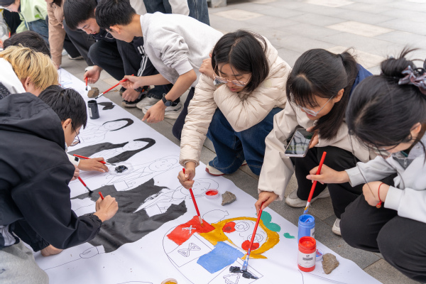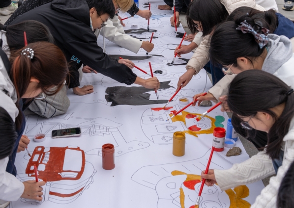活动现场暖意融融、氛围热烈,6米长的大地彩绘卷铺开后,各支部成员分组协作,围绕活动主题展开创作。象征科技创新的齿轮、车辆专业的车轮剪影、安全专业的安全标识、展现青年活力的奔跑身姿……青年们手持画笔,将专业特色与青春思考融入每一笔色彩,不同支部成员打破壁垒、密切配合,讨论声与笑声交织,让长卷逐渐成为凝聚集体智慧、献礼团代会的“青春画卷”。